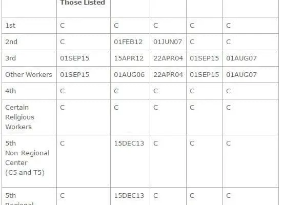 EB3 Category: For all areas of chargeability the cutoff date is Sept. 1, 205 while China is April 15, 2012 a few days from the previous date. For India the new date is April 22, 2004 and Philippines is August 1, 2007.